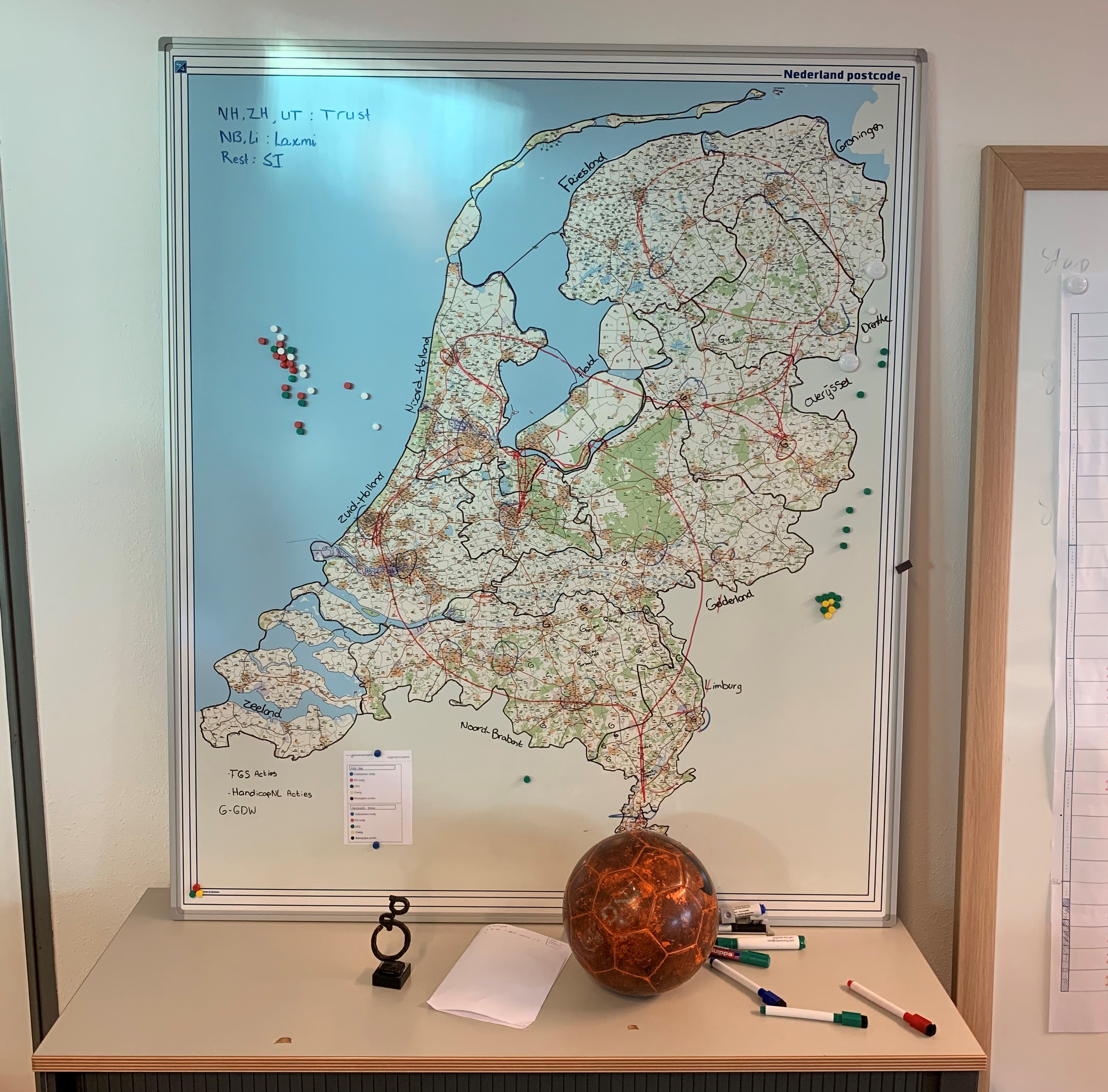 Op het kantoor van Fonds Gehandicaptensport in Amstelveen hangt een hele grote landkaart van Nederland. Toen we hier een aantal minuten naar aan het staren waren, kwam al snel de eerste ingeving om het logo van Fonds Gehandicaptensport in de route te verwerken. Het begon met een stift. Op gevoel het logo tekenen, maar eerlijk gezegd begon het idee langzaam vorm te krijgen. We kregen het logo steeds duidelijker in de route en dat was een enorm gave start.